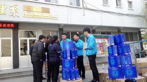 近日,我校校友、16届毕业生薛庆照回母校访问,为学校师生赠送了200多套蓝月亮套盒,并做了一场生动的科学洗衣报告。
