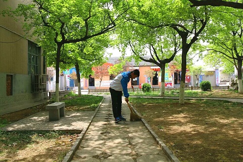 佩带工作证,清扫小道,清除纸屑、树叶,就算是死角也不放过。