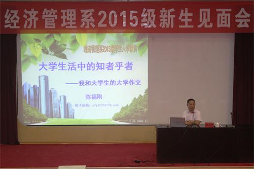 9月28日下午,经济管理系党总支副书记、副主任陈福刚在东校园四号报告厅为2015级会计专业新生作题为“大学生活中的知者乎者——我和大学生的大学作文”的入学教育报告。