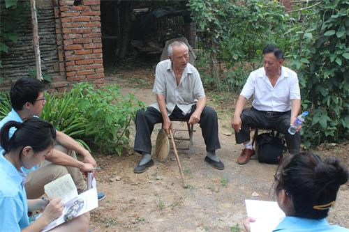 首先,实践团队成员与花园村村委会杨主任进行对接,杨主任表示非常欢迎并将全力支持团队到村里调研;团队负责人王新亮老师介绍了该调研项目的目的和意义并对花园村的支持予以感谢。然后,当地文史学者、作家、王庄镇史志办原主任孔庆珍先生向大家介绍了该地在抗日战争时期的典型事迹。同学们又就课题研究提出问题,孔庆珍先生都一一耐心地给予解答。接下来,负责“地方抗战遗址保护”项目的四名成员采访了村里的老党员杨建岭,杨建岭老人绘声绘色地讲述了自己在抗战时期的亲身经历和该地的抗战历史。最后,大家前往参观了花园村藏书胜地陶南别墅,对陶南胜地的文化作了一定了解,