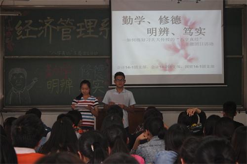 为弘扬习近平总书记在北大师生座谈会上提出的勤学、修德、明辨、笃实的“八字真经”精神,5月5日下午,由会计14-1、会计14-2、国贸14-1团支部联合承办的如何练好习大大传授的”八字真经”主题团日活动在4210教室成功举办。