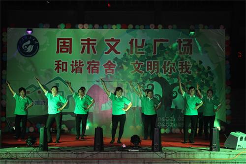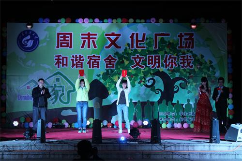 携手共创优秀文明宿舍,欢歌笑语共度难忘今宵。本次周末文化广场,以火辣动感、舞姿柔美的《crazy》为开场舞,在主持人清晰响亮的话语下拉开帷幕。绚丽的灯光,跳动的焰火,宛如空气中欢快的精灵,装扮着这美丽的夜晚。首先,由经管系、资土系分别带来的独唱《偿还》、《睡在我上铺的兄弟》用不同的风格向观众们展现了宿舍文化的魅力;本次晚会最惹人注目的要数来自金地源物业公司的宿管阿姨们为我们带来的节目,一曲《又见炊烟》 、11人广场舞《小苹果》 ,向年轻人展现出了老一辈别具一格的风采,欢呼声此起彼伏,将晚会推上高潮;由资土系、机电系与经管系分别带来的小品《推销风波》、《男生寝室惊魂夜》与《美好的幻想》,幽默风趣的戏剧性表演形式,生动夸张的语言与跌宕起伏的情节,吸引着观众的眼球,让在座观众时不时捧腹大笑;此外,动感唯美的舞蹈《S》,将曼妙的舞姿表现的淋淋尽致,展示出科大学子的朝气、青春与活力,最终,晚会在经管系文艺部带来的歌舞串烧《年代SHOW》中圆满落幕。本次活动中,还举办了优秀宿舍、星级宿舍、和谐宿舍、标兵宿舍、学习宿舍与文明宿舍的颁奖仪式,出席嘉宾为获奖宿舍代表颁奖。此外,本次晚会还开设了抽奖环节和微博墙,加强了与观众的互动。
