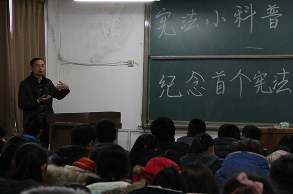 为迎接12月4日全国“宪法宣传日”,增强大学生的宪法意识,弘扬宪法精神,加强宪法实施,全面推进依法治国,12月4日下午,由经管系学生会和社团联联合举办的首个宪法日主题讲座活动在4210教室顺利开展。袁庆远担任本次主题教育讲座讲师。