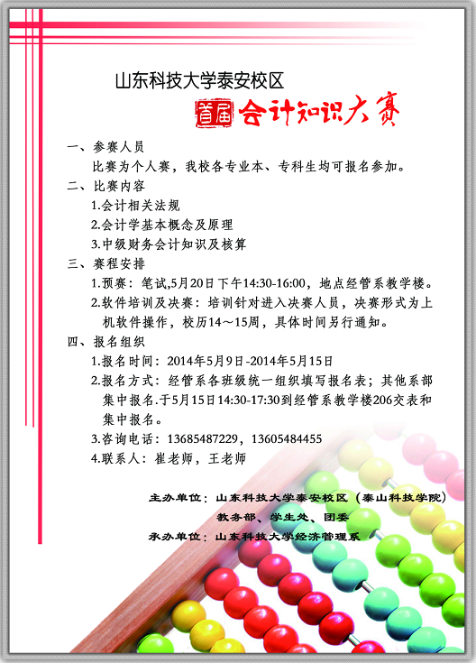 为培养和提高我校学生对会计知识技能的掌握和应用能力,本学期校区(学院)将举办首届会计知识大赛,具体内容如下: