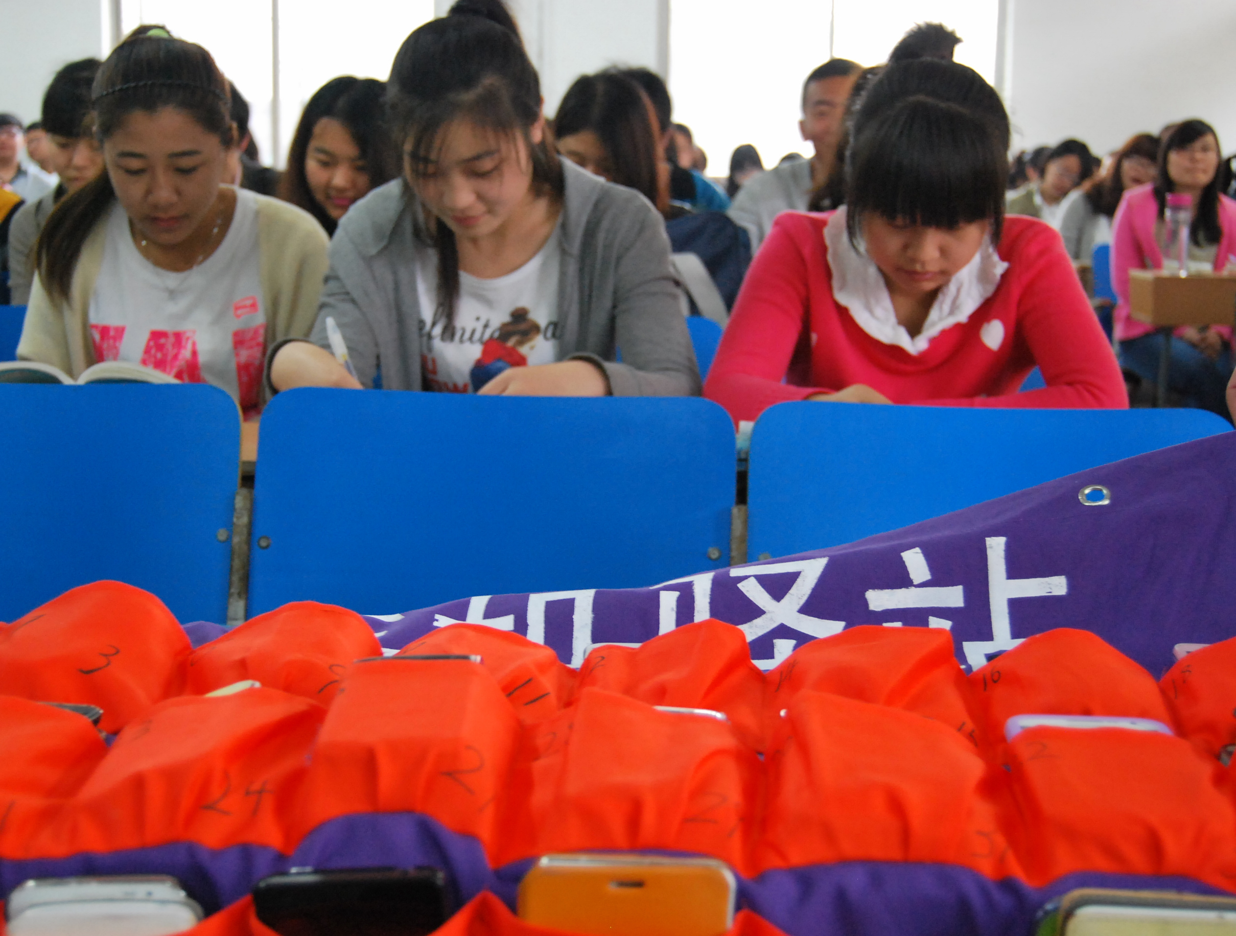 现在,经管学子们正在越来越认可一项新的课堂纪律,即上课的时候手机不能在自己身上携带着,要放在手机收纳袋里。上课铃声响前,班级里两名“管理员”就将同学们的手机集中收集,放在手机收纳袋。看着收上去的各式各样的手机,望着“手机管理员”忙碌的动作,其他同学开始了课前的最后准备。