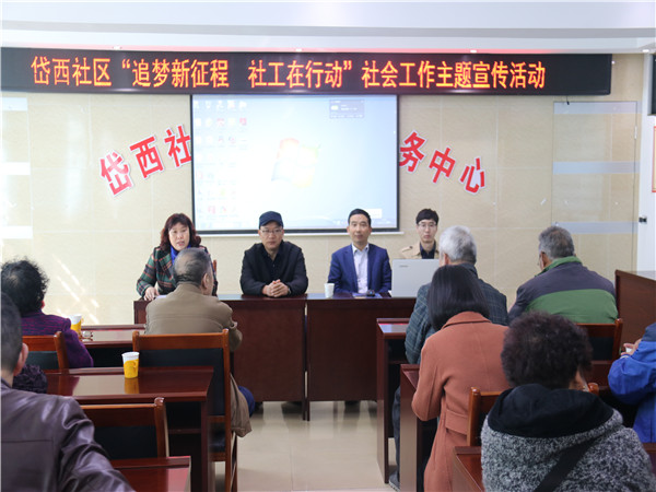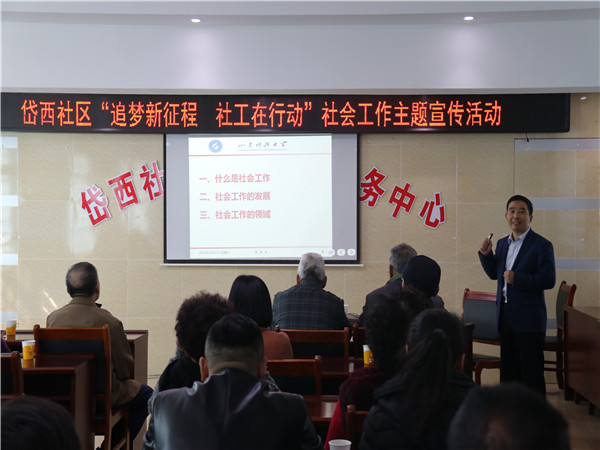 2019年3月23日上午,泰安市泰山区岱西社区在社区讲堂召开“追梦新征程 社工在行动”社会工作主题宣传活动。文法系社会工作教研室桑爱友主任、周海明老师及张乐老师受邀参加,为社区工作人员、党员及居民做主题讲座,讲解社会工作理论知识、传授社会工作实务方法、宣传社会工作价值理念,让居民们真正了解社会工作、熟悉社会工作、认可社会工作。