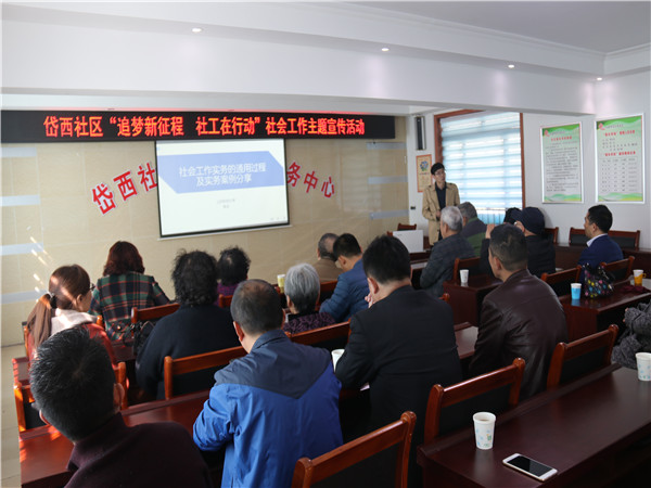 社会工作教研室桑爱友主任首先以《社会工作及其发展》为题,为大家讲解了社会工作的基本知识以及发展过程,从宏观角度说明了社会工作的重要性以及国家政府对社会工作的支持,引起了大家的高度关注和认可。接着,张乐老师从微观角度为大家讲了《社会工作实务的通用过程及实务案例分享》,并结合自身实务经历,深入浅出地讲解了社会工作实务的一般过程,使居民对于社会工作者的工作过程有了全面的了解。