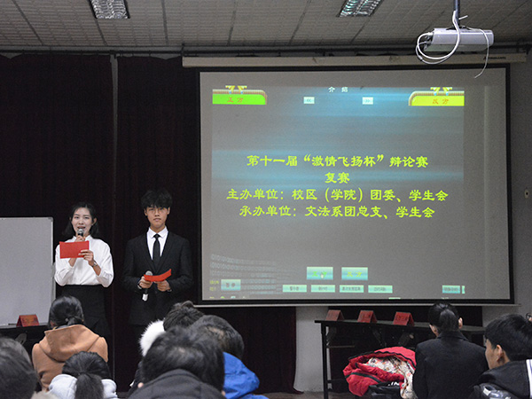 11月27日下午,由校区、学院团委,学生会主办,文法系团总支、学生会承办的第十一届“激情飞扬杯”辩论赛复赛在文秘情景实验室举办,各系学生会主席及往届辩论赛优秀辩手担任比赛评委,学生会组织负责人及学生代表观看比赛。