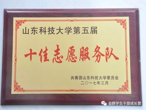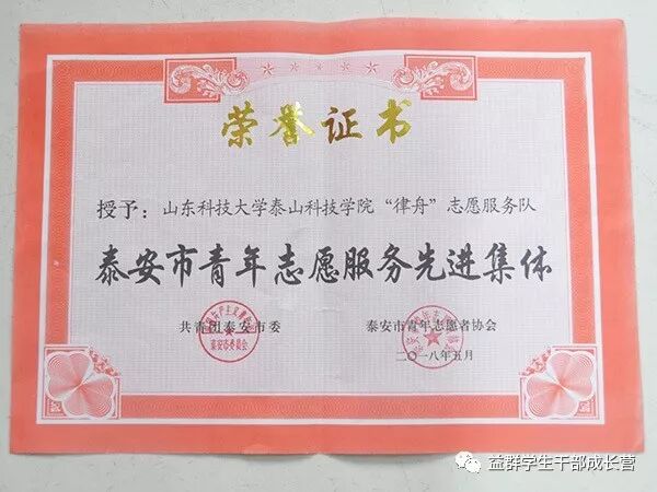 “律舟”志愿服务队曾于2015年和2017年两次荣获山东科技大学“十佳志愿服务队”称号,在2018年荣获“泰安市青年志愿服务先进集体”称号。