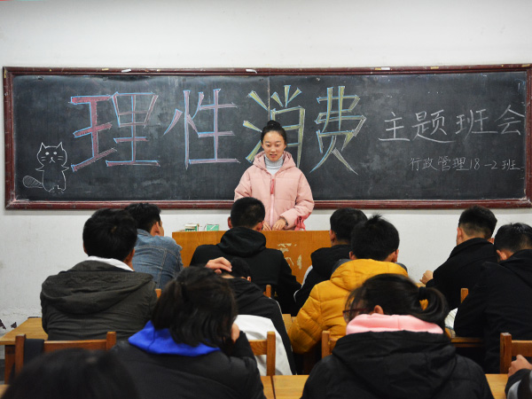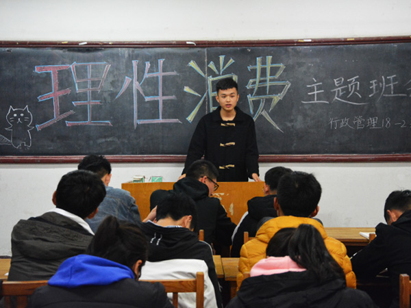 11月11日晚,文法系行政管理18-2班在5306举办“理性消费”主题班会,班会由班长曹宪超主持,行政管理18-2班全体同学参加。