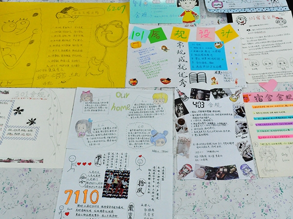 此次活动主题为“向陋习告别,与文明握手”。经过前期的宣传,文法系大一、大二、大三的同学参加比赛,参赛宿舍设计好具有自己宿舍特色的舍规及公约,并派一名代表到礼堂指定地点按照年级上交作品。同学们用文字、图片等多种形式来设计舍规和公约,内容包含学风、舍风、安全、卫生等方面。他们的作品有的用秀丽的毛笔字书写,有的用淡雅的水彩画和精美的贴纸装饰。作品上交完成后,学生会部长团将按照作品内容和设计风格进行统一打分。最终,7号楼西单元203等3个宿舍获得一等奖,7号楼中单元306等5个宿舍获得二等奖,7号楼中单元307等10个宿舍获得三等奖。