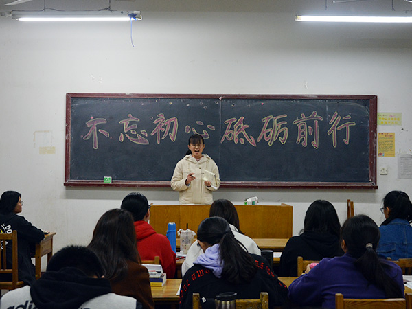 班会伊始,郭晨对本周班级在宿舍、课堂等出现的问题进行总结,并针对这些问题对同学们提出要求。随后,各个宿舍代表向大家分享自己对初心的理解。有的同学认为他们的初心是实现学习与能力的兼具,有的同学认为则是开阔自己的眼界,发挥自己的潜能。同学们积极踊跃地发言,畅谈自己未来的规划以及对未来的期望。郭晨用北大新任校长王恩哥上任时所说的十句话勉励同学们以实际行动实现自己的初心。最后,由各个班委上台发言,向同学们说明他们的工作思路与工作规划,并请大家予以监督和支持。