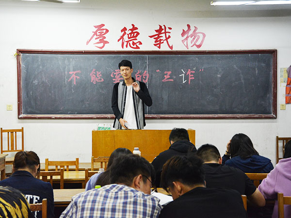 班会伊始,班长尹一帆以一个防诈骗案例为切入点,从来电、报警、笔录、涉案、醒悟等方面,以幽默诙谐的剧情体现出诈骗犯手段高明、算计缜密以及对人心掌控的娴熟。同时,尹一帆强调诈骗犯往往用法律概念、国家党中央、犯罪嫌疑人等词恐吓当事人,致使当事人上当受骗,他叮嘱同学们要时刻保持警惕、遇事不慌,必要时寻求公安部门的帮助。