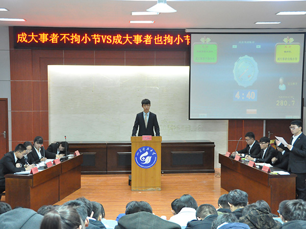 比赛分为立论、攻辩、自由辩和总结陈词四个环节,经过初赛的激烈角逐,共有四支队伍成功晋级复赛,分别为资土系“我们说什么都队”、文法系“决战岱岳之巅队”、信息系“辩傲江湖队”和机电系“雄辩队”。经抽签决定,第一场辩论赛由信息系对战资土系,辩题为“知难行易VS知易行难”,双方辩手针锋相对,唇舌枪战,台下掌声不断。尤其是在最精彩的自由辩环节,辩手你来我往,气势如虹,现场气氛迅速升温。第二场辩论赛由文法系对战机电系,辩题为“成大事者不拘小节VS成大事者也拘小节”,首先由双方一辩简述观点,他们旁征博引,有条有理。在随后展开的攻辩环节中,他们根据对方的种种提问寻找破绽,发散思维,步步紧逼,进行激烈交锋,为现场观众奉上一场旗鼓相当的高水平对决。最终,资土系“我们说什么都队”斩获冠军,文法系“决战岱岳之巅队”获得亚军,成功晋级决赛。