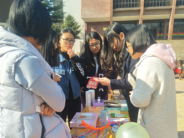 礼堂前举办的“易达创业周”活动吸引众多同学的目光,同学们纷纷前来购买自己喜爱的物品。