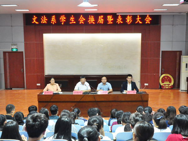 9月29日,文法系在模拟法庭举行学生会换届暨表彰大会,文法系党总支副书记刘相明、团总支老师、第十二届学生会全体成员、获奖学生代表和大一各班班长等150余人参加,会议由郭艳培主持。