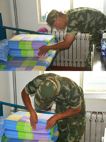 教官多次到宿舍指导“豆腐块”的叠法,一整理一折叠,都体现出他们的严谨之风。
