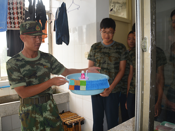 教官在为同学们展示整理好的洗漱用具,同学们对教官熟练的动作手法感到非常敬佩。