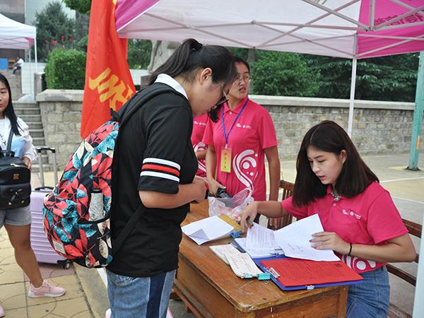 文法系17级共有7个班级,新生认牌报到,排队办理,井然有序。