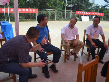 文法系主任张学银与17级新生及其家长交谈新生的入学、住宿情况。