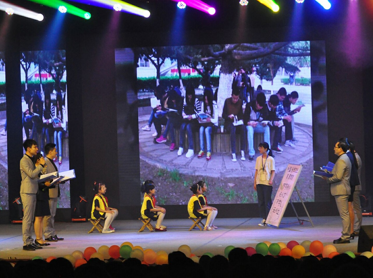 本次朗诵分为三部分:师生朗诵、舞台剧情景再现、LED屏大学回忆。