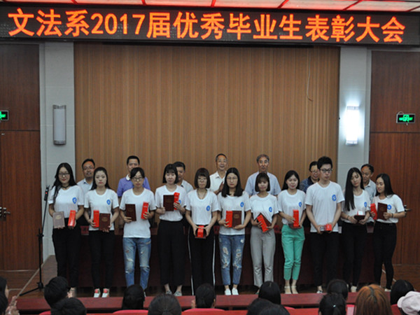 马福泉宣读了《文法系关于表彰2017届毕业生先进集体和先进个人的决定》。2017届毕业生在升学考试、选调生考试、公务员考试和事业编考试中取得了优异成绩。唐信玲等37人考取了硕士研究生;于明月等17人成功考取了省内外的选调生、公务员或事业编;杨智等10人通过了国家司法考试,王加千通过了大学生入警公安现役考试,陆敏等3人志愿服务西部。张蕾同学同时通过了研究生、司法考试并考取了山东省公务员。根据《文法系优秀毕业生评选办法》和《文法系优良学风班 优良学风宿舍评选办法》,经研究,决定授予法学13-2班优良学风班荣誉称号,授予7号楼307宿舍等19个宿舍优良学风宿舍荣誉称号,授予唐信玲等70名同学“文法系2017届优秀毕业生”荣誉称号,为通过司法的同学每人颁发奖金200元。与会领导老师为优秀毕业生颁发了荣誉证书和纪念品。