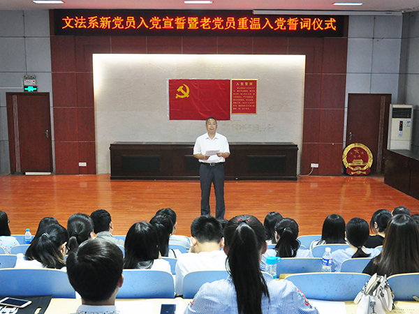 6月15日下午,文法系在模拟法庭举行“新党员入党宣誓暨老党员重温入党誓词”仪式,文法系党总支书记马福泉、副书记兼副主任刘相明、团总支老师及全体学生党员参加,仪式由学生第一党支部书记刘明远主持。