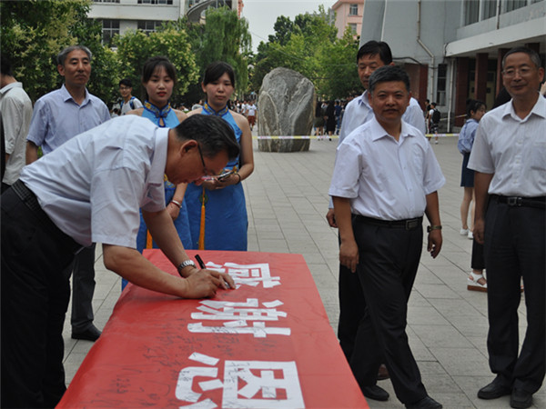 6个毕业生班级依次与校区领导及老师拍照留念。之后,毕业生在印有“感谢恩师教诲,书写青春梦想”的条幅上签下自己的名字,这条横幅包含着毕业生们对老师的感恩和对未来的憧憬。副校长兼泰安校区党委书记、管委会主任王少鹏等在条幅上签字,希望毕业生们脚踏实地,更好发展。(文:郑丽绚 图:葛庆盼 范玉雯)