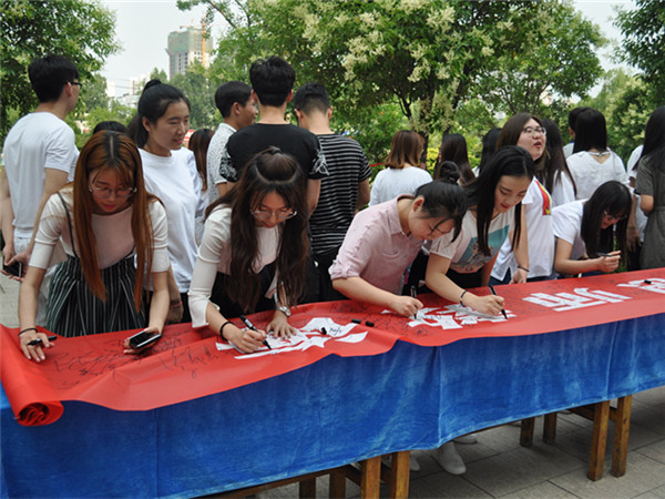 6月13日下午,文法系2017届毕业生进行毕业合影和毕业条幅签字活动。