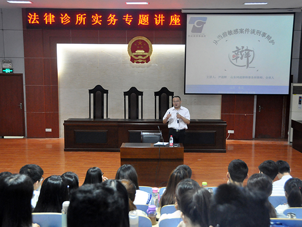 本次专题讲座分为刑事与民事两部分。首先,尹逊辉律师以“从当前敏感案件谈刑事辩护”为主题,以聊城辱母案、河南赵作海等案件为切入点,结合自身从事刑辩的多年经验,深入浅出地向同学们讲解刑事律师的情怀、刑事律师和委托人的关系、以审判为中心的证据质证等多方面的知识,向同学们展示律师实务的魅力。于兆国律师则以最高人民法院买卖合同司法解释主要内容为中心,结合真实案例,主要讲解买卖合同纠纷法律实务的若干问题,一解同学们的日常学习疑惑,并鼓励同学们积极参加研究生考试、司法考试,提高理论修养,用理论来指导实践。随后,两位律师与台下同学展开互动,针对大二法学生今后的学习规划,他们谈到:“法学是一门大家学科,同学们在学好专业课的基础上,还应重视社会学的学习,重视个人魅力的提升,未来做一名敢辩、能辩、有恒心、有信心的法律人。”