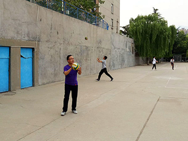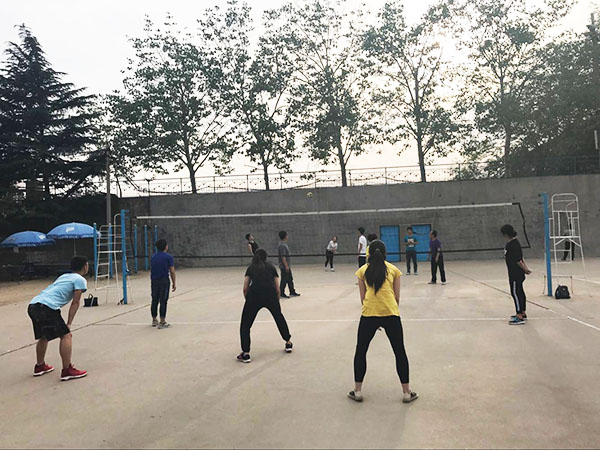 文体系积极鼓励学生“走出宿舍、走下网络、走向操场”,并组建文法系男、女排球队,聘请亓慧坤老师与陶庆萍老师分别担任男女排教练,每周二组织队员参加集体训练。训练过程中,老师积极参与,并以师生排球赛的形式进行交流,同时在老师的带动下,队员们训练的热情更加高涨。比赛在裁判的哨音中拉开帷幕,垫球、传球、击球、起跳、扣杀,场内气氛火热。