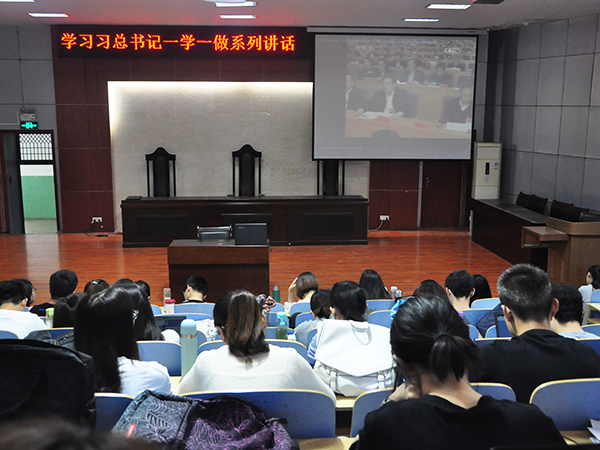5月17日,文法系法学15-1团支部、法学15-2团支部在模拟法庭组织观看习近平总书记系列讲话视频,15级法学专业全体成员参加。