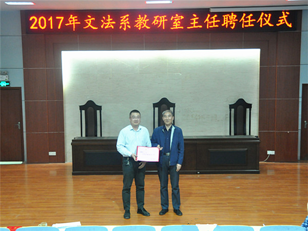 5月2日下午,文法系在模拟法庭举行2017年文法系教研室主任聘任仪式,系党总支书记马福泉主持,系全体教工参加。