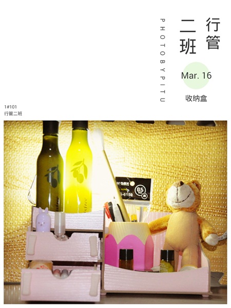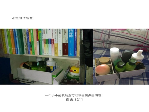 比赛以“创新、整洁、温馨、环保、文明和安全”为标准,共有16个宿舍参加。各宿舍在舍长带领下,齐心协力,积极开动脑筋,化零为整。各个宿舍的收纳风格不一,各有特色。最终,1#202宿舍将废弃纸盒自制成鞋架、置物架,以巧妙的构思获得同学们的一致好评,荣获一等奖。(文:葛庆盼 袁华蕊)