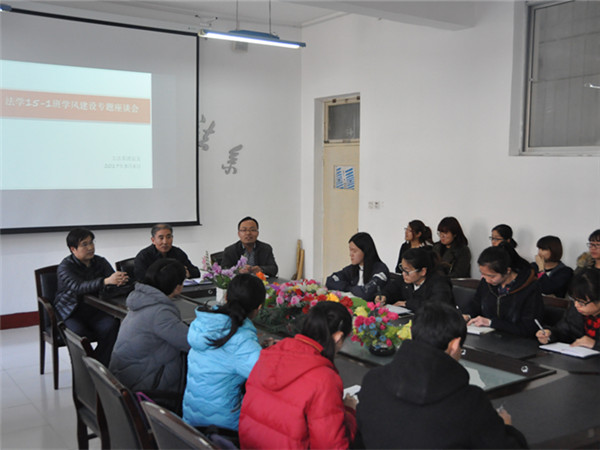 3月8日下午,文法系法学15-1班在系会议室召开学风建设专题座谈会,系主任张学银,英语教师倪西军及法学15-1全体同学参加会议,会议由系团总支书记郭涛林主持。