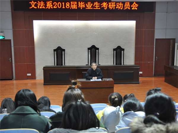 为调动同学们的考研积极性,加强学风建设,充分挖掘自身潜力,做好职业生涯规划,3月1日晚,行管14-1和秘书学14-1学生考研动员会在模拟法庭召开,文法系主任张学银为同学们作了动员报告。