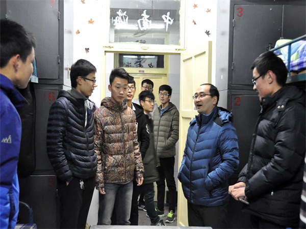 1月5日晚,文法系团总支老师带领学生会成员,对系学生宿舍进行离校前宿舍安全大检查。