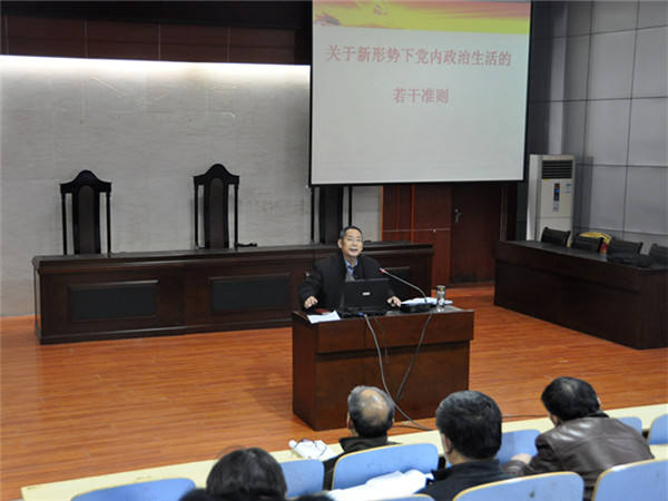 12月13日下午,文法系组织全体教职工在模拟法庭集体学习了中共中央总书记习近平在全国高校思想政治工作上发表的重要讲话以及《关于新形势下党内政治生活的若干准则》,文法系党总支书记马福泉利用多媒体进行了宣讲。