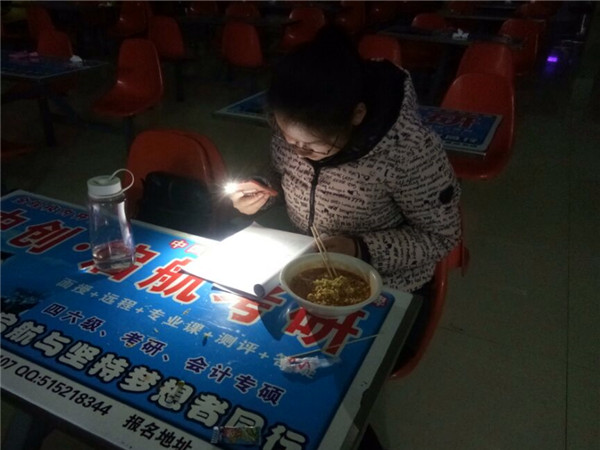 早上六点,食堂还未营业,吃着泡面打着手电学习。