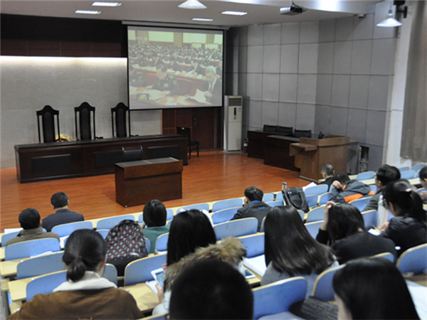 11月1日下午,文法系党总支组织全体教工和学生党员50多人在系模拟法庭集体学习了党的十八届六中全会公报和专家对全会的解读。