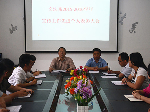 6月2日下午,文法系在系会议室举行2016年宣传工作先进个人表彰会,文法系党总支书记马福泉、党总支副书记兼副主任刘相明、团总支老师、学生会主席团、班级主要学生干部和全体新闻社成员参加,会议由文法系团总支书记郭涛林主持。