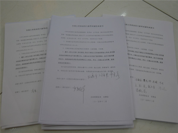 全国大学生英语四六级考试即将来临,为进一步加强考风考纪教育,营造公平、公正、诚实、守信的考试氛围,树立良好的考风考纪,以考风促学风,近期,文法系团总支发出诚信考试的倡议,组织同学们签订全国大学英语四六级考试诚信承诺书。