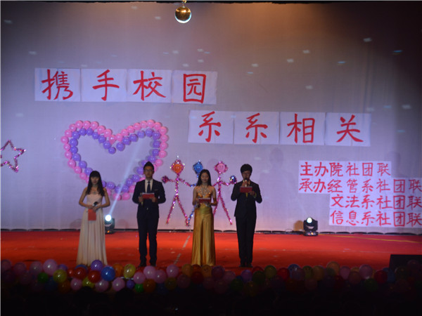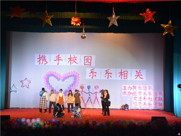 为加强西校园三系之间的联系,丰富同学们的课余文化生活,共同建设和谐文明的校园文化环境,12月12日晚,由院社团联主办,经管系社团联、文法系社团联和信息系社团联联合承办的双十二联谊晚会在礼堂成功举办。
