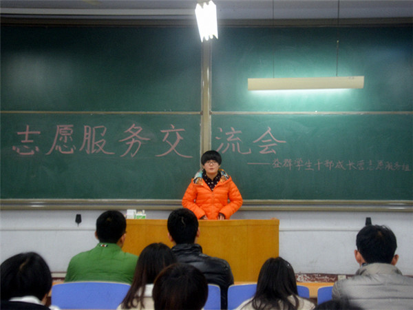 交流会伊始,志愿服务组副组长胡兴爽结合自己曾两次在道朗镇大王庄小学进行志愿服务的经历和同学们进行了交流。她提到:“在志愿服务的活动中,服务队的队员们向孩子们普及法律与人身安全知识,不但锻炼了自己,也丰富了人生阅历。因而志愿服务是一次与众不同的体验,更是人生的一笔宝贵财富。” 紧接着,服务组里三位成员都发表了自己对志愿服务的看法,都讲到了他们曾参与过的志愿活动与收获,并且呼吁同学们积极行动起来,为社会贡献自己的一份力量,体验“赠人玫瑰,手留余香”的快乐。