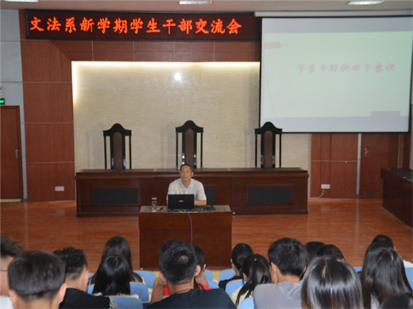为了进一步发挥好学生干部的带头作用,增强责任意识和大局观念,促使学生干部真正养成自我学习、自我管理、自我进步的良好习惯,9月6日,文法系在模拟法庭召开新学期学生干部培训会,会议由文法系党总支副书记裴国栋主持。