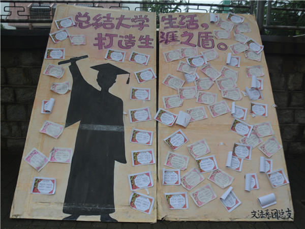 为欢送2015届毕业生,留下毕业生们的美好记忆和经验得失,文法系团总支在毕业生离校前开展了总结大学生活,打造生涯之盾的活动,6月25日,毕业生离校之际,专题展板在礼堂前展出。