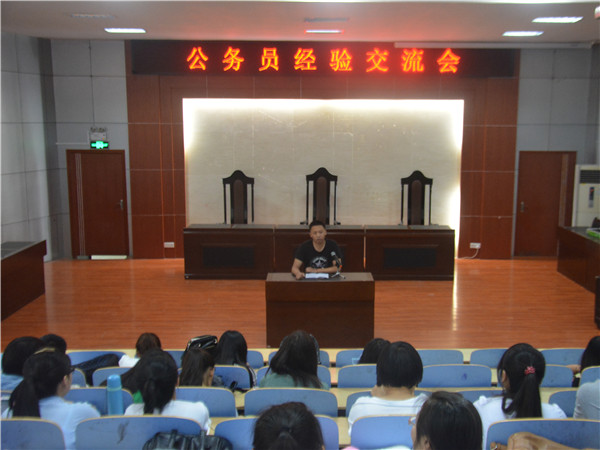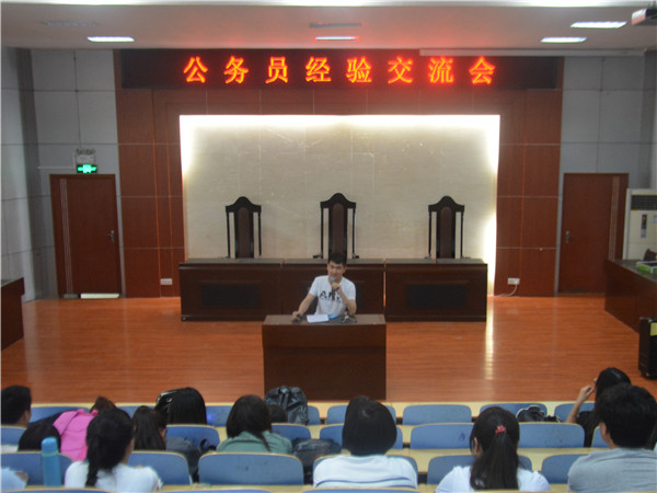 6月5日下午,由文法系团总支主办,系学生会办公室和学习部联合承办的公务员考试经验交流会在模拟法庭成功举行。考取济南市铁路公安局国家公务员的张壮壮,考取江苏省灌南县法院公务员的邵立志和考取江苏省兴化市法院公务员的吴玉明作为嘉宾与同学们分享了他们的成功经验。