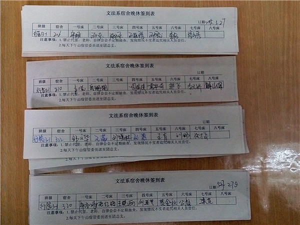 据悉,此次签到制度将为期一个月,将与定期早签、不定期查早起、晚休制度相结合,旨在加强宿舍纪律的监督检查力度。为此,文法系团总支专门印制了《文法系宿舍晚休签到表》。表中内容有班级、宿舍、日期、各个床位人员。具体要求是每位同学在晚休之前在表上签上名字,因请假等原因未在校的要注明。各个舍长每天需将签到表交至各班宿管委员手中,再由各班宿管委员每天下午交至团总支。各班同学应认真对待,禁止他人代签,禁止补签。团总支老师及自律会相关人员将不定期进行抽查,发现情况不实者将追究相关人员责任。签到制度的实施既有助于早签人员及查晚休工作人员工作的顺利开展,也有利于提高工作效率,在宿舍纪律检查中起到了良好的桥梁纽带作用。