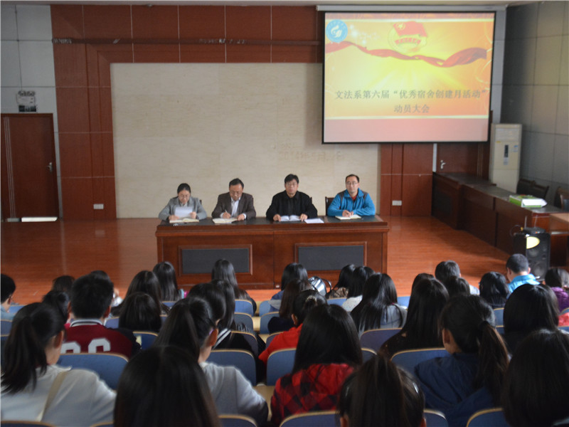 为全面提高同学们的综合素质,增强同学们的文明修养,4月17日下午,由文法系团总支主办、自律会承办的第六届优秀宿舍创建月活动动员大会在模拟法庭召开。文法系学生工作干部、学生组织负责人、班长团支书和宿管委员以及宿舍长参加了此次会议。