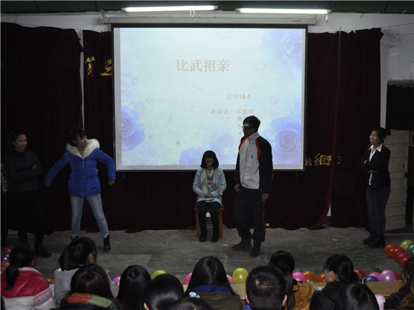 动感的开场舞拉开了比赛的帷幕。选手们轮番上阵,《期末考试风波》《女生宿舍的违禁电器》节目中选手们认真的表演态度,真实的情感流露,完美演绎了在校大学生同学关系的重要性。生动幽默的对口相声《西征梦》,二人一捧一逗,配合默契;《比武招亲》《土豪相亲》等古今相亲节目倾情上演,而且反串角色扮演等花招层出不穷,滑稽搞笑的神情及夸张的肢体动作博得场下阵阵热烈掌声。最后,法学14-1班的《比武招亲》摘得桂冠,法学14-1班的《土豪相亲》和行政管理14-1班的《西征梦》获得二等奖,《梦幻家园》《期末考试风波》《收视率帝王》获得三等奖,范梦龙,郑翼分别获得最佳男、女演员称号。